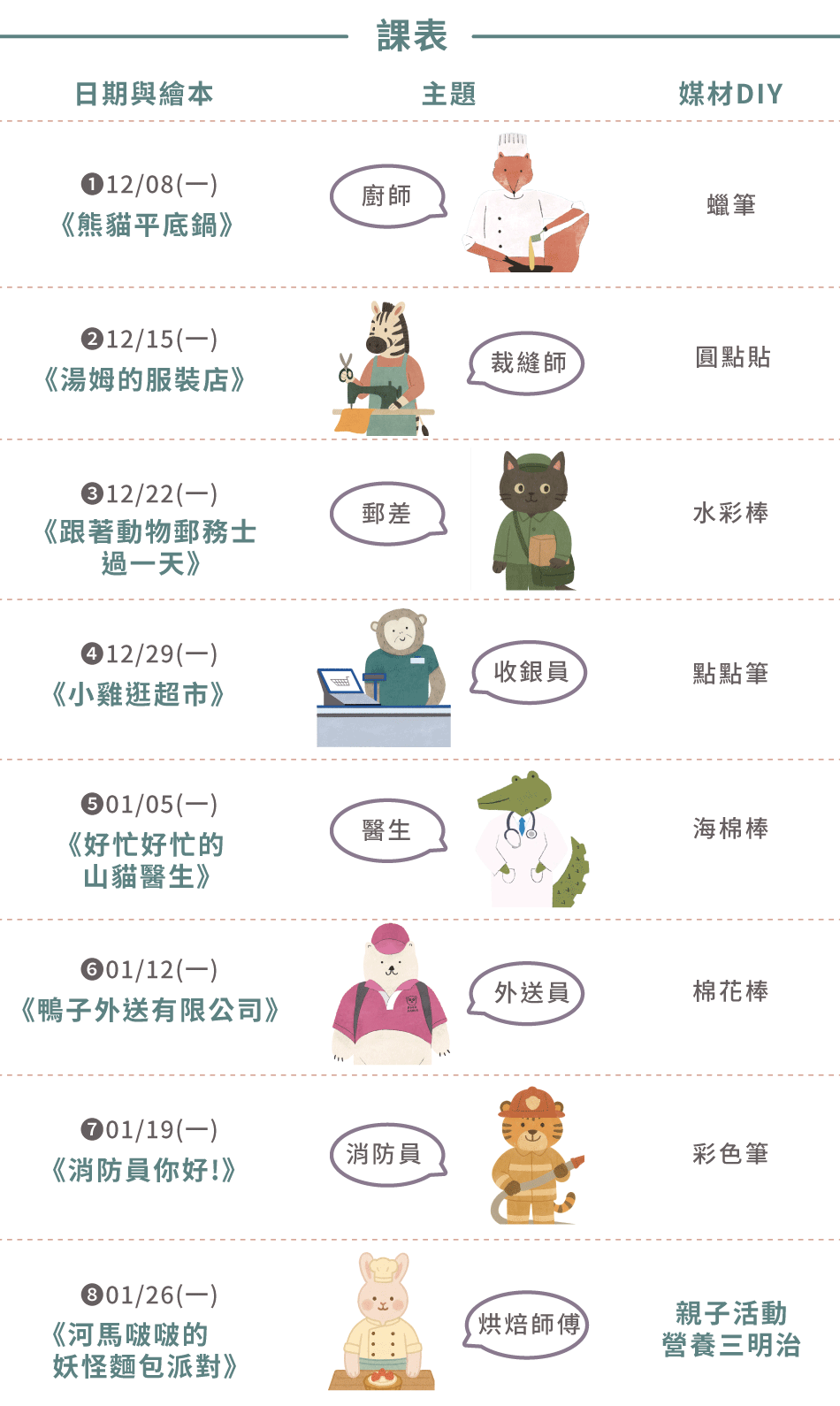 2025年冬季小時光,孩子在大教室內的活動會扣著「職業」主題,每週不同主題繪本故事,讓孩子認識各式各樣職業,這次將有裁縫師、郵差、消防員等新職業主題喔,也依當週主題進行好玩的遊戲與活動。每週會運用不同媒材,讓孩子進行DIY,8週完成後,會集結成一本小書唷!每堂課都有孩子分區域的free play時間,在寬敞的教室中,交給他們自由探索,選擇最喜歡的角落時間,暢遊自己的play time!