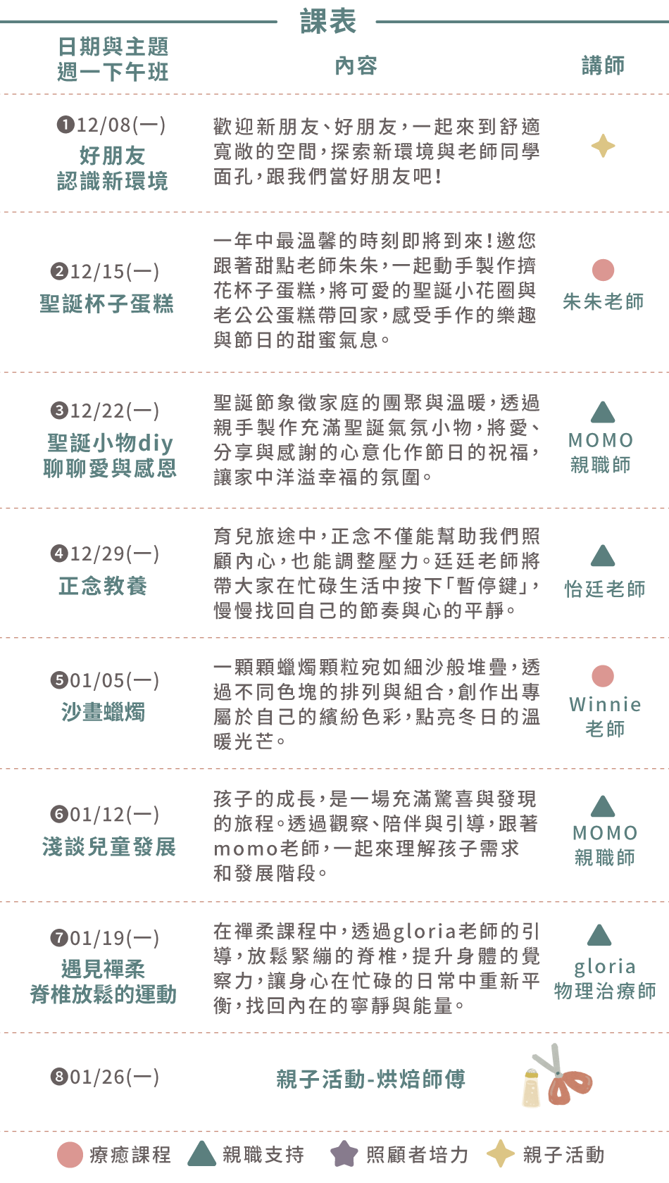除了一杯飲品與稍作休息,每週會有一小時的照顧者活動,分成四大類型課程:療癒課程、親職支持、照顧者培力與親子活動,安排不同的老師來與大家分享,除了有沙畫蠟燭、禪柔與健康存摺等,在充滿聖誕節慶氛圍的十二月,特別安排了充滿耶誕氛圍的擠花杯子蛋糕,MOMO老師也安排在聖誕節前夕,一起DIY聖誕小物,聊聊愛與感恩,廷廷老師也將會陪大家一起聊聊正念教養。最後一週的親子活動,要與孩子們一起完成營養三明治喔!