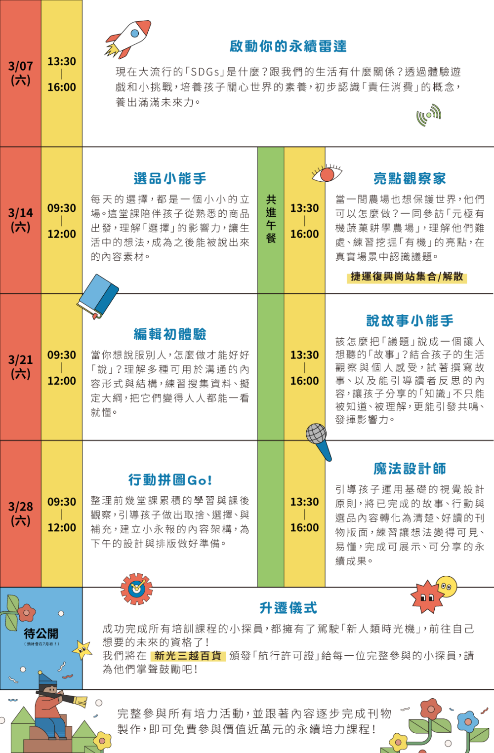 全系列課程單組價值近萬元,但為培養孩子的永續知能、推廣永續議題,此系列報名唯需繳納保證金共1,500元,且完整參與7次培力課程、並於2026/4/13(一)前繳交隨課程引導完成的刊物,且由家長協助完成前、後測回饋表單後,即可全額退回。