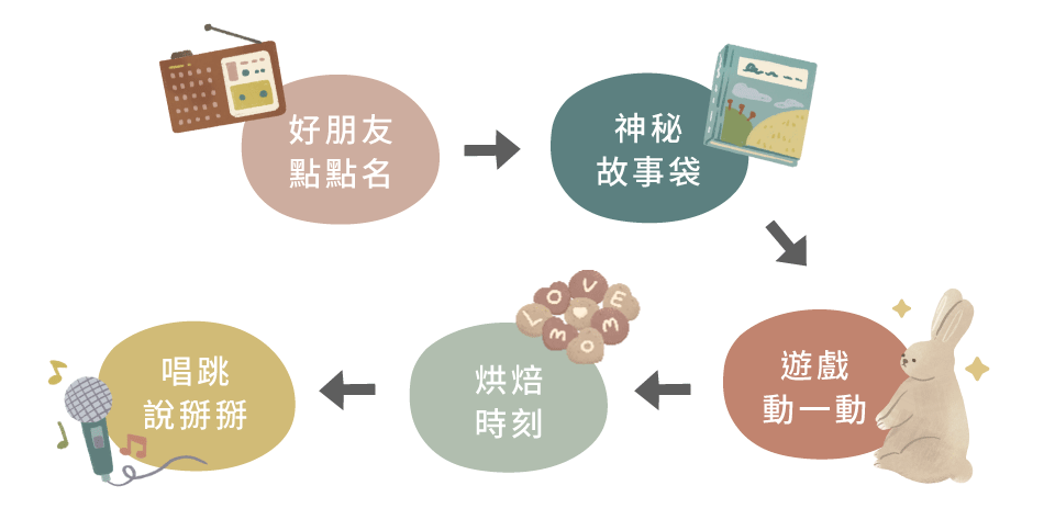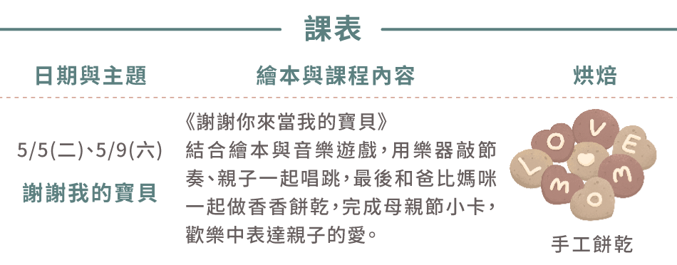 最後,親子將一起動手揉麵糰、製作香氣四溢的餅乾。孩子在操作中體驗烘焙的樂趣,也為媽媽準備一份甜甜的驚喜。完成餅乾後,小朋友還會親手做一張愛心母親節卡片,把心裡想說的話送給媽媽。從故事、音樂到烘焙與手作,讓這堂課不只是活動,更是一段充滿愛與陪伴的母親節小時光。 課程進行方式