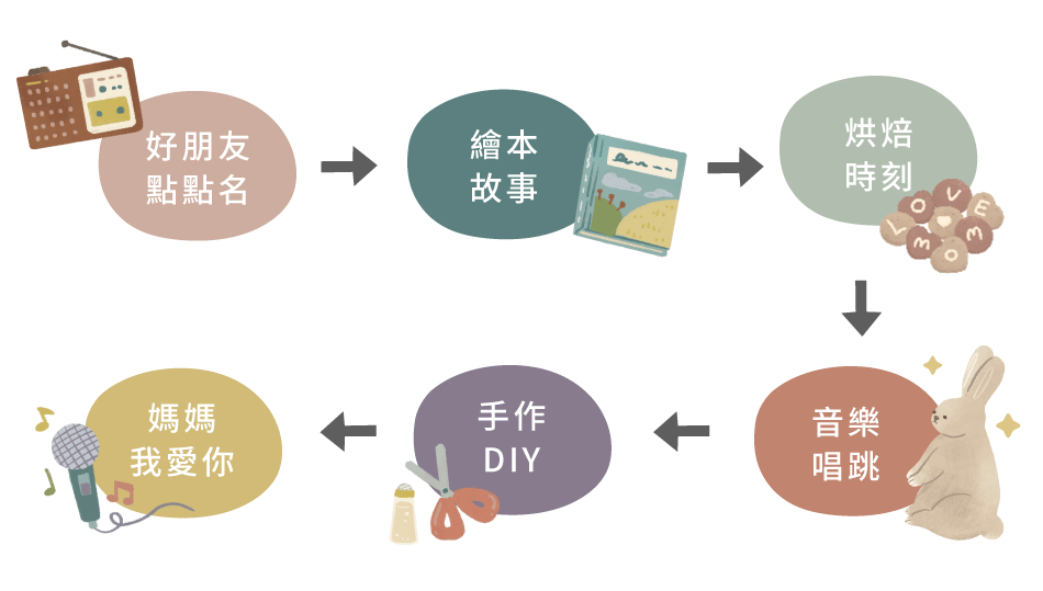 一起創造溫馨特別的母親節回憶吧!表達彼此滿滿的愛吧!課程透過繪本故事、烘焙手作、創意DIY花束,感受愛與感謝的溫暖時光~孩子也能練習動手操作、培養創造力唷!最後一起唱溫馨的《抱抱魔法》歌曲 ,用音樂與擁抱,傳遞親子間最真摯的愛!