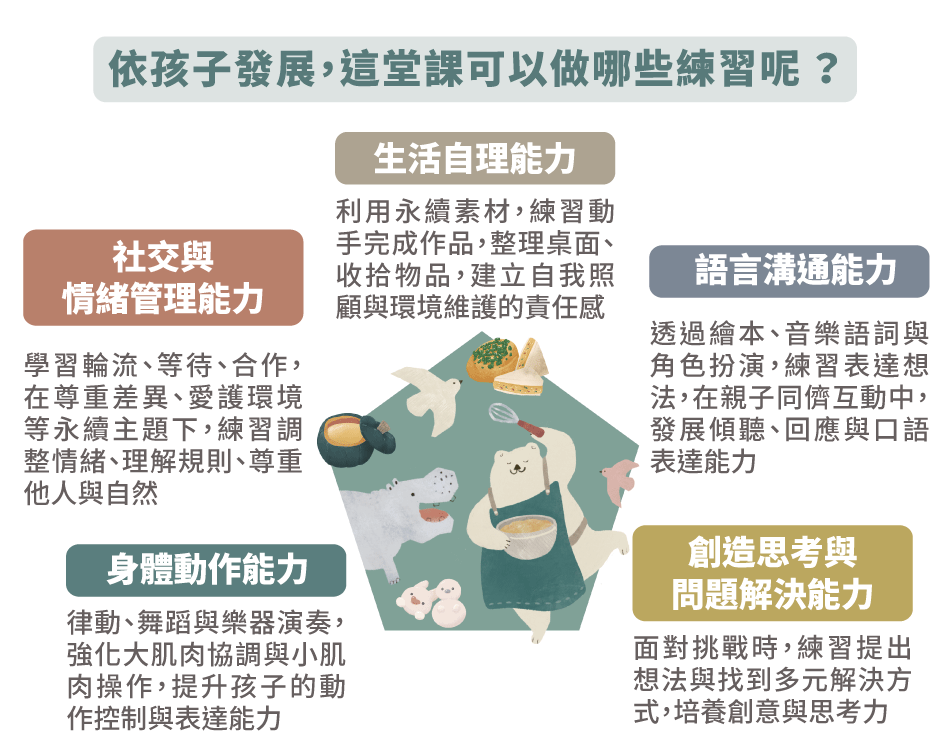 透過每週不同的繪本主題、音樂曲風的感受等等,與親子一起用木琴、音磚、海洋鼓、邦哥鼓等等各種樂器,從好玩有趣的音樂遊戲當中,認識永續的指標,運用不同樂器與媒材,從音樂遊戲中讓親子認識永續指標,也透過課程完成DIY手作,進而一起練習實踐於生活中。
