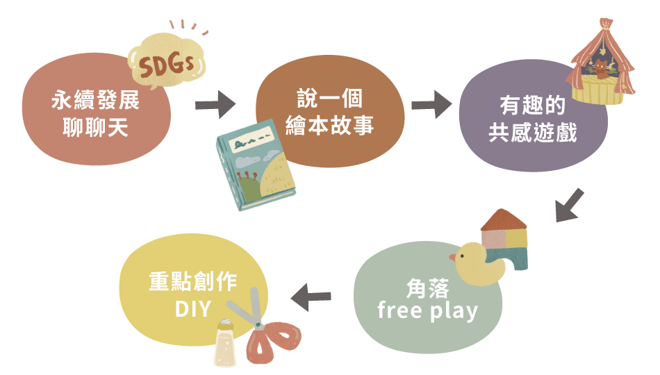 從日常的打招呼開始,融合主題課程內容的寒暄,好聽的永續繪本故事、影片,不同媒材的DIY創作,課後的20分鐘free play,結合近生活設計的永續互動區域,讓孩子自己挑選喜歡的區域,培養親子思考、啟動生活的小改變唷!