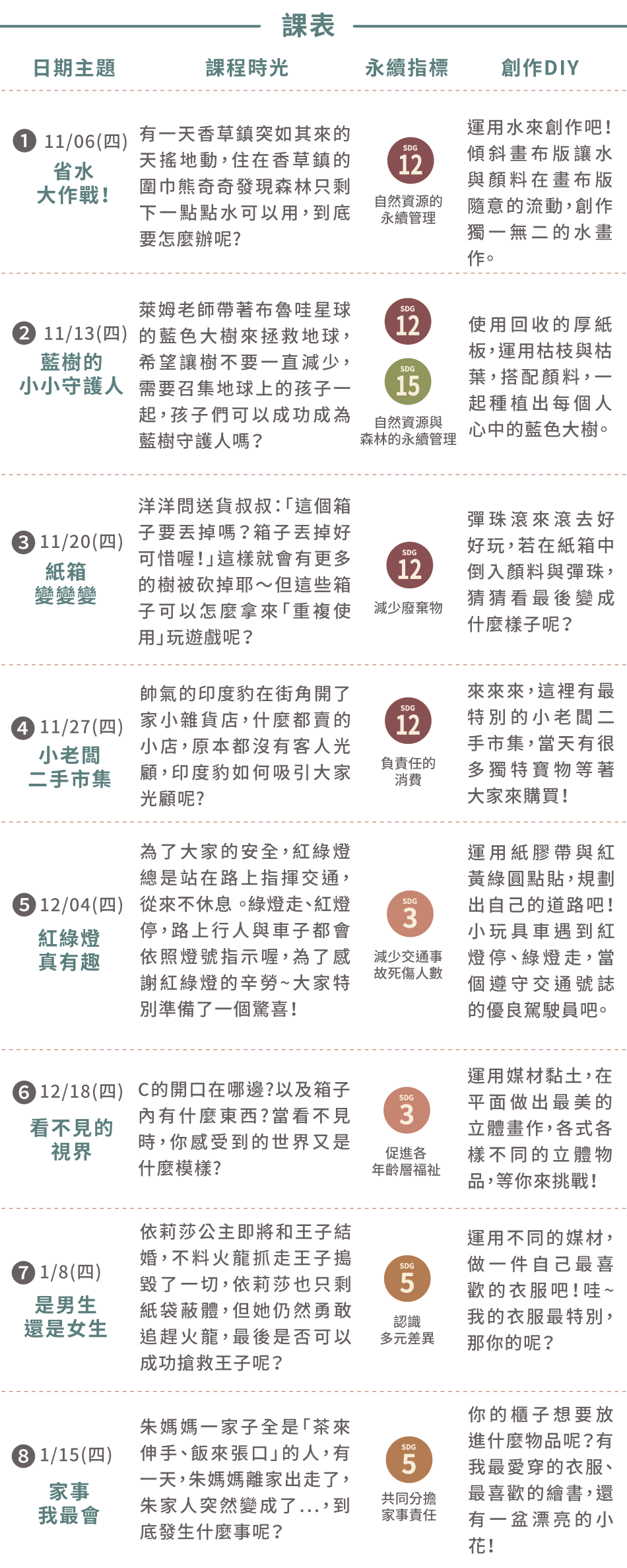 此系列針對「SDGs永續發展指標」,運用不同媒材讓孩子接觸美學,也透過課程安排與完成作品讓親子認識永續跟生活息息相關,並可實踐在生活中。