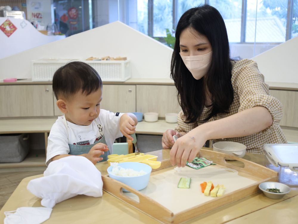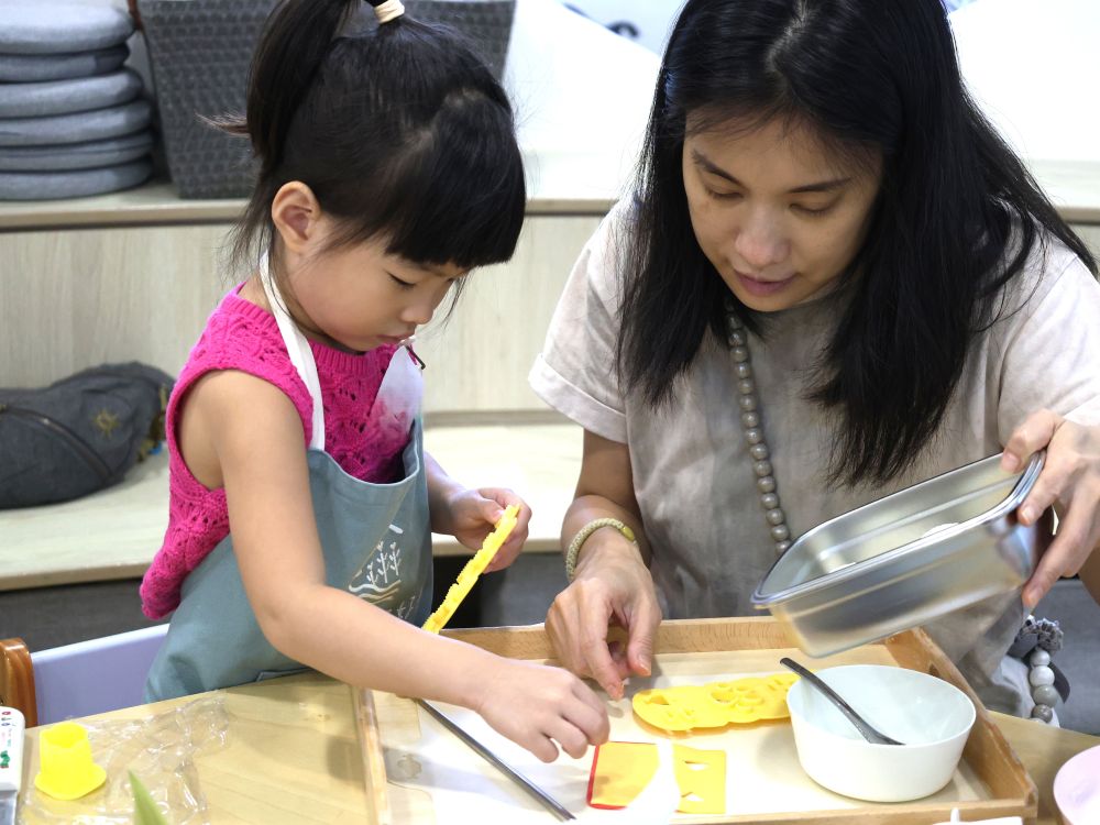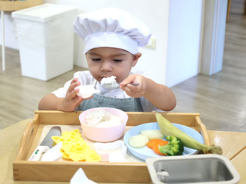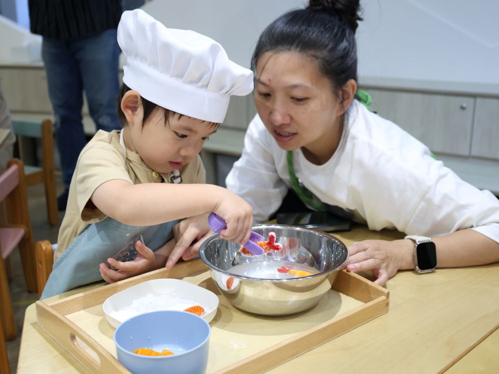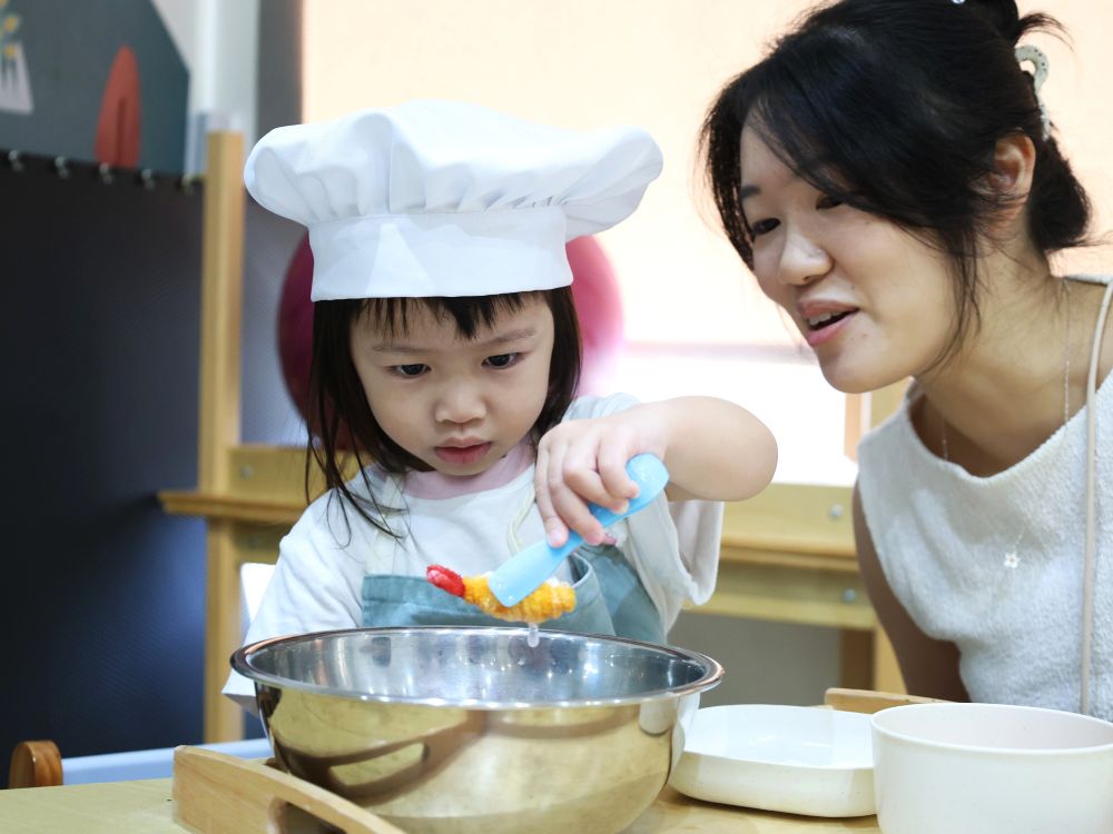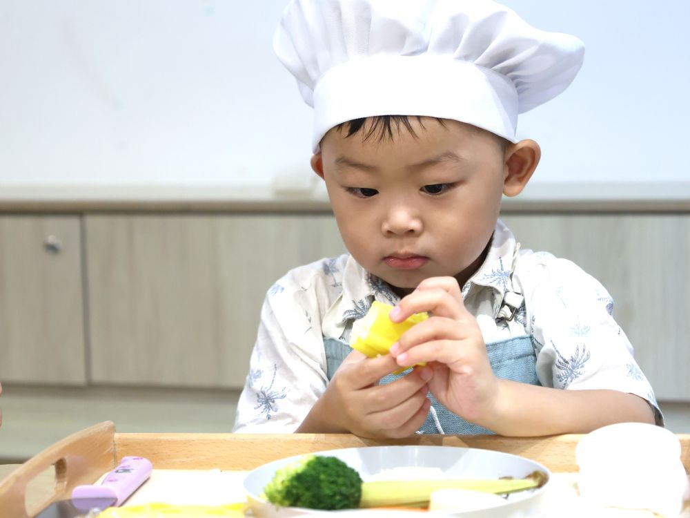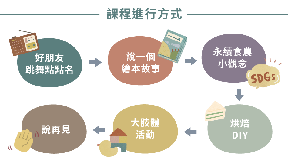 課程結合繪本、烘培DIY、食農永續 ,以輕鬆有趣方式,認識食材的外觀、味道和生長過程,培養珍惜食物的意識。也在動手做烘焙中,透過切、搓、攪拌等動作鍛鍊手部精細動作與專注;並藉由課程中的烹調步驟,例如「加入幾湯匙」等,引導孩子認識基本數,及在按照老師指令做出相對應行為中,訓練語言與認知能力。