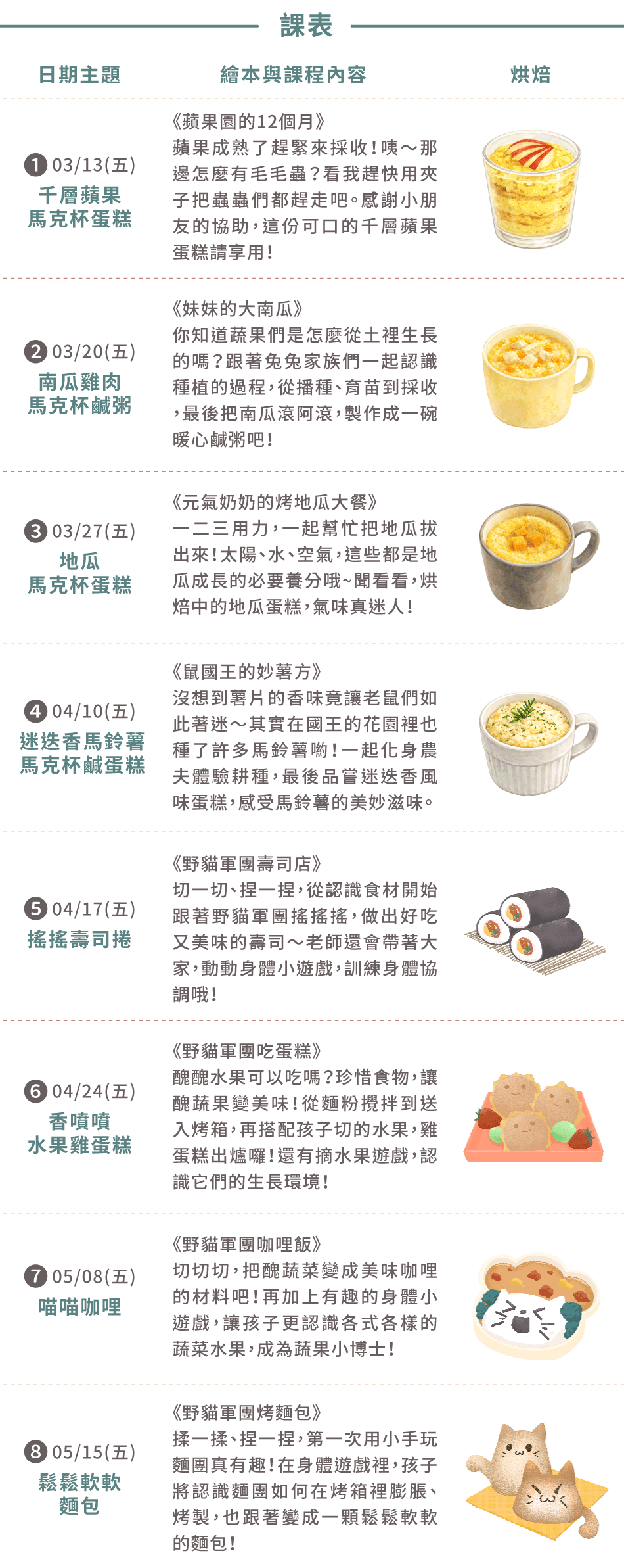 有馬克杯,就能在家輕鬆玩烘焙!前四堂,將把蘋果、地瓜、南瓜、馬鈴薯等常見食材,搖身一變成馬克杯料理,好吃又好玩!後四堂則進入繪本化身「野貓軍團」出動,製作壽司、蛋糕、咖哩、麵包,並跟著老師腳步,看看課堂中還有哪些趣事與驚喜正準備登場!