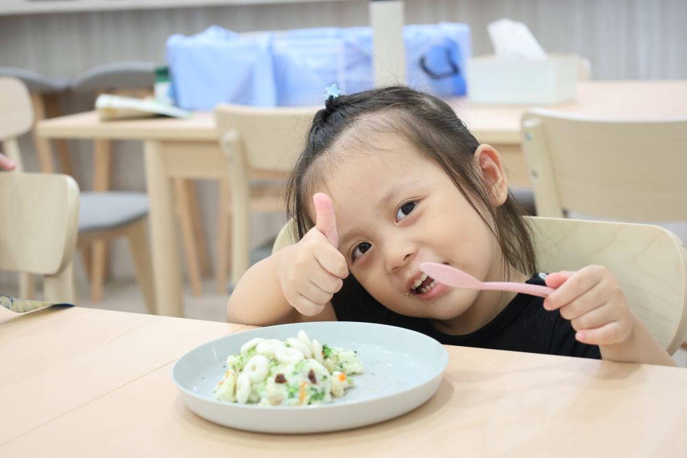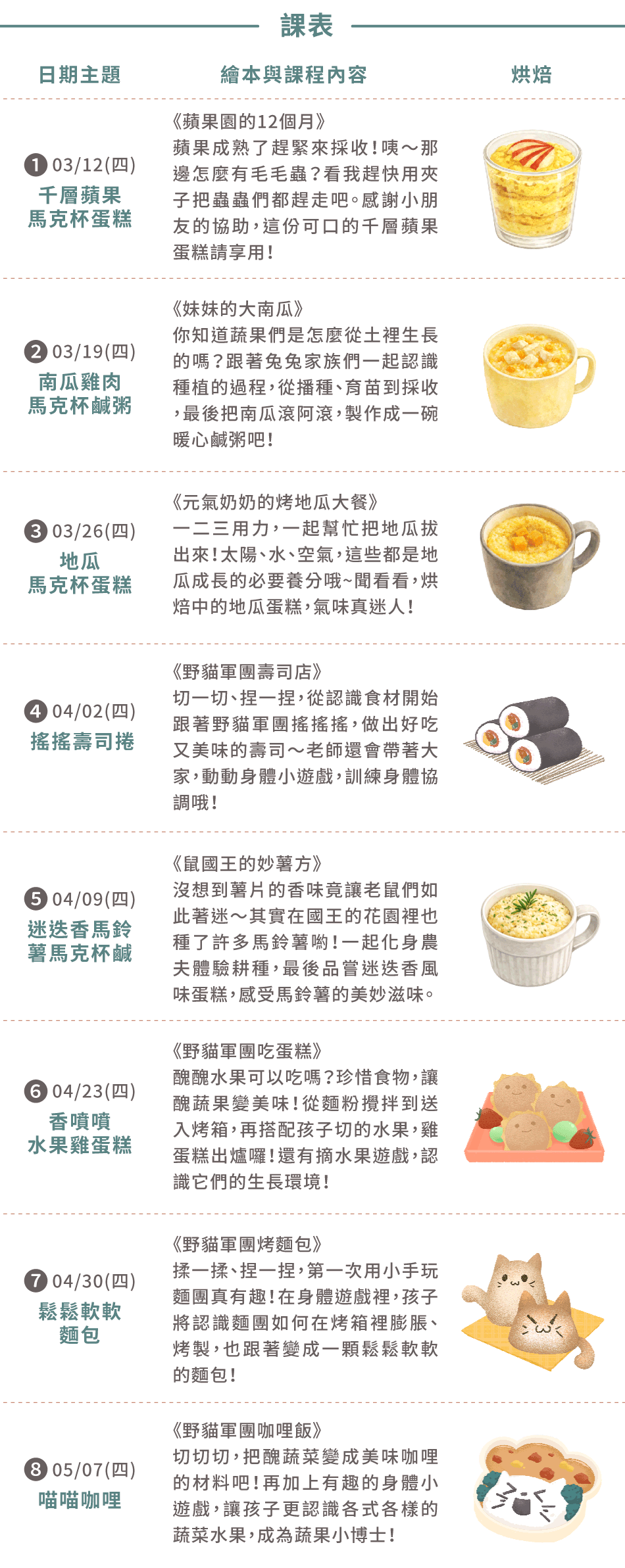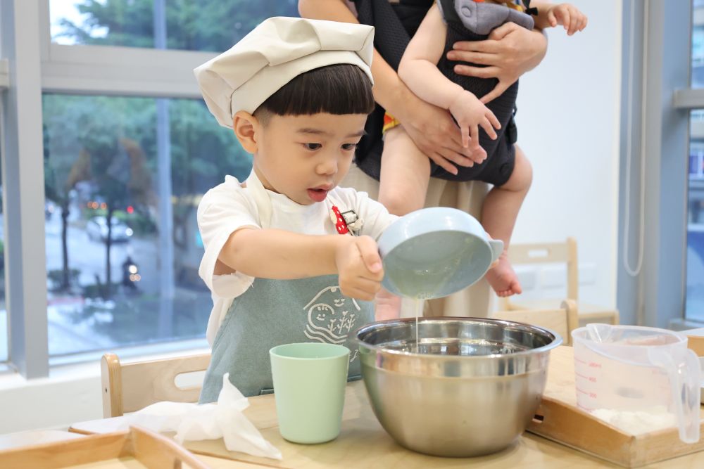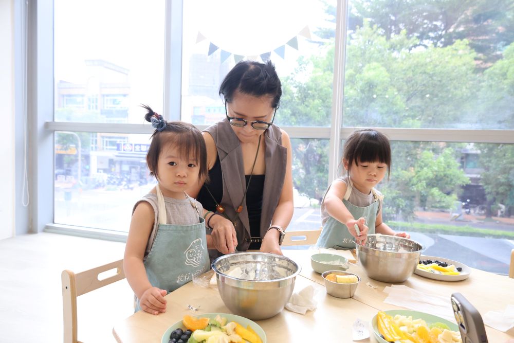 課程結合繪本、烘培DIY、食農永續 ,以輕鬆有趣方式,認識食材的外觀、味道和生長過程,培養珍惜食物的意識。也在動手做烘焙中,透過切、搓、攪拌等動作鍛鍊手部精細動作與專注;並藉由課程中的烹調步驟,例如「加入幾湯匙」等,引導孩子認識基本數,及在按照老師指令做出相對應行為中,訓練語言與認知能力。