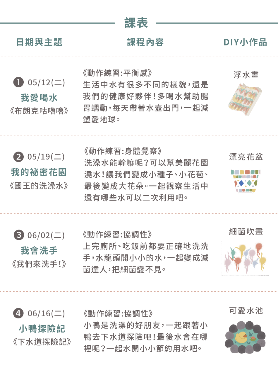 課堂上以生活中隨處可見的水,設計親子間好玩的身體遊戲,讓孩子認識水的循環、功用及危機,引導孩子在互動情境中與家長開啟對話,利用課後回家小任務,一起完成永續小挑戰,讓孩子從生活中實踐永續好習慣。