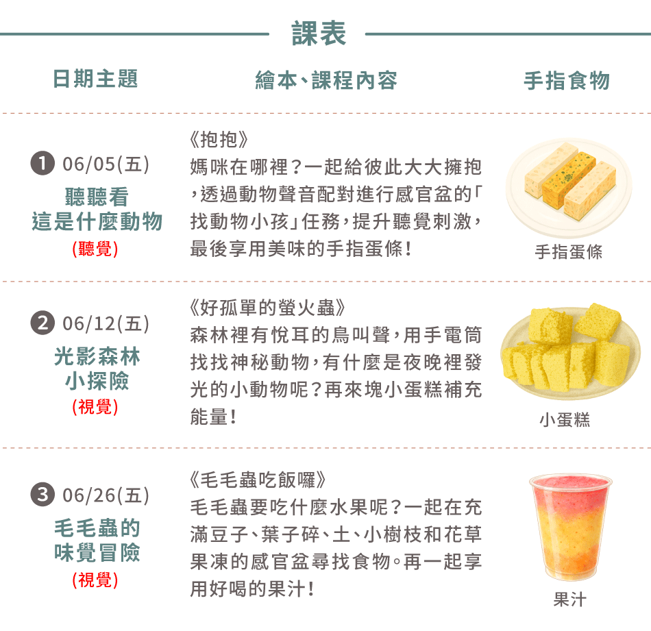 1.5~2.5歲是孩子語言與感官快速發展的黃金期!透過「聽故事、玩感官、吃點心」的親子互動,讓孩子在觸摸、觀察、探索中,練習手眼協調、語言表達與自我能力。每一堂課都從繪本延伸感官遊戲,還有小小補給站的健康點心,是一堂好吃、好玩、又能讓孩子感受世界的快樂課!
