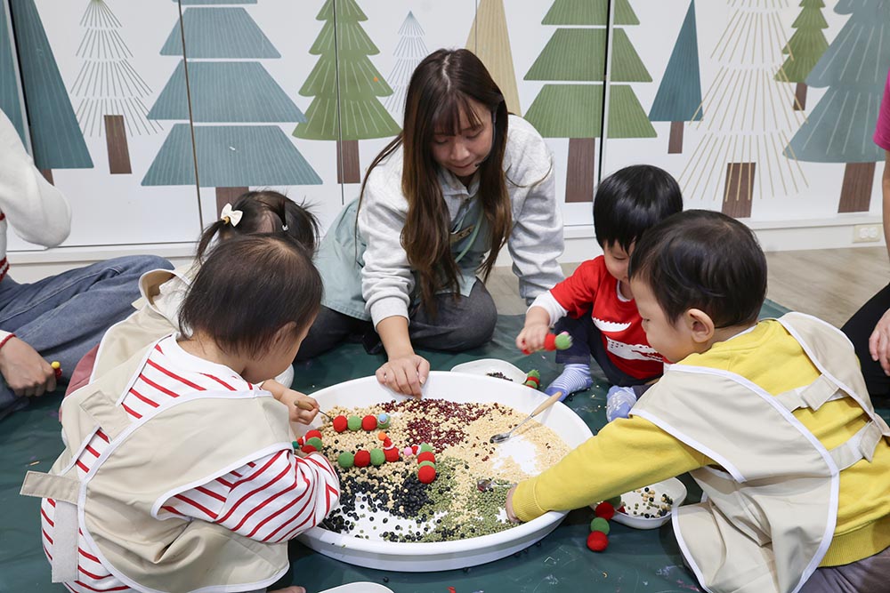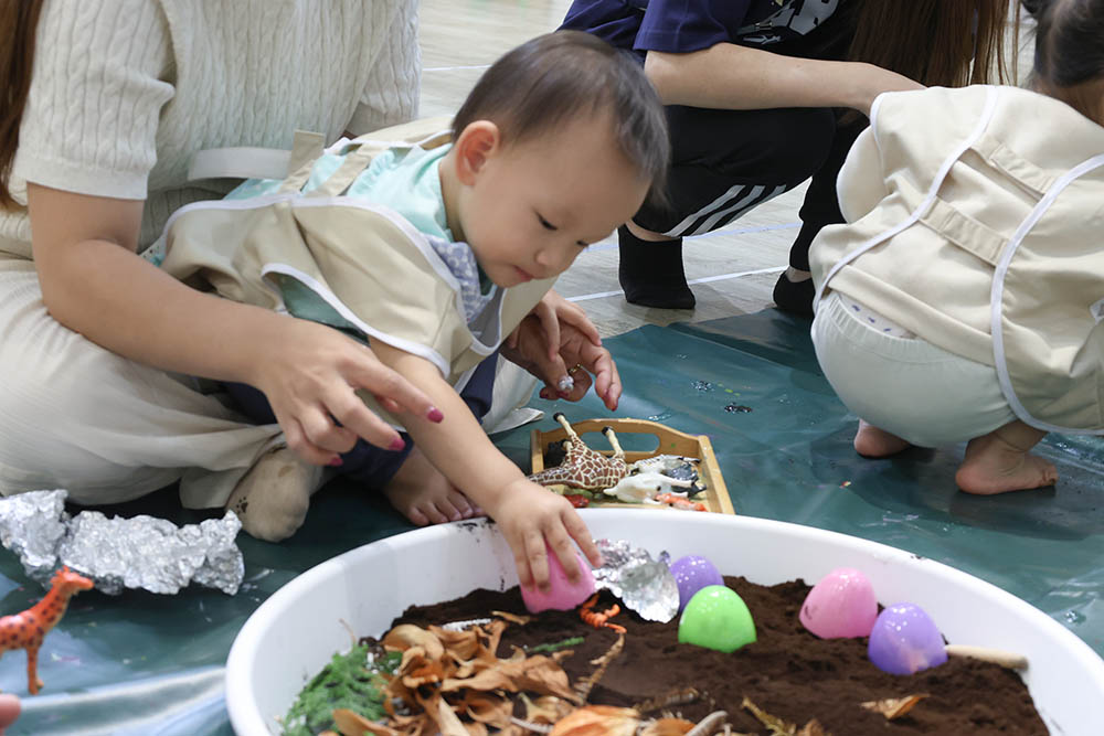 每堂課根據繪本主題規劃互動豐富的感官盆遊戲,在吉利丁、碎葉子、彩色米粒中,一起找動物寶寶、幫毛毛蟲找食物等遊戲,孩子不僅能刺激觸覺與視覺,還能練習手眼協調、分類配對、創意思考,親子一起探索,讓學習從「好玩」開始,也幫助孩子累積感官經驗。