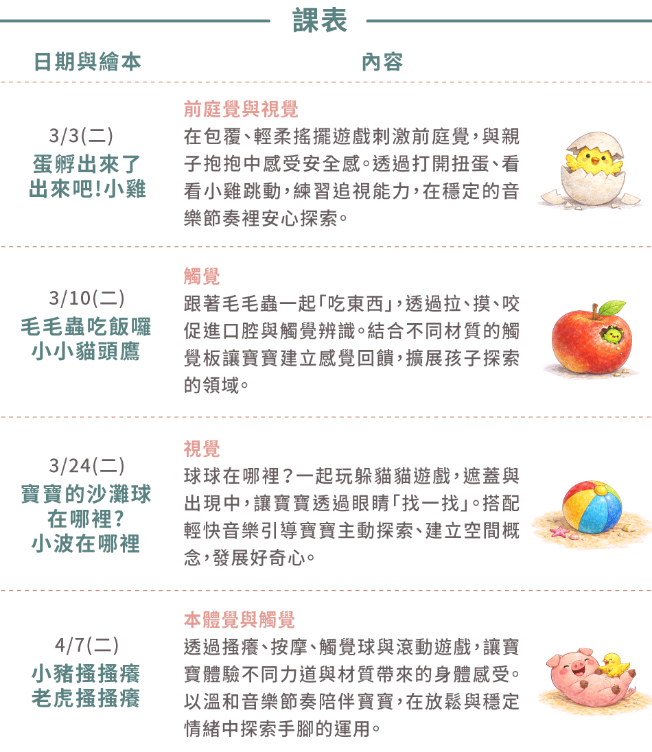 結合雙繪本、音樂節奏與感官遊戲,從打開蛋殼、用眼睛找找搖晃的小雞在哪裡、玩水果沙鈴、找找躲起來的球,到親子透過觸覺球搔搔癢、按摩滾一滾身體,親子一起玩,也陪寶寶一步步認識自己,也自然練習感官探索。