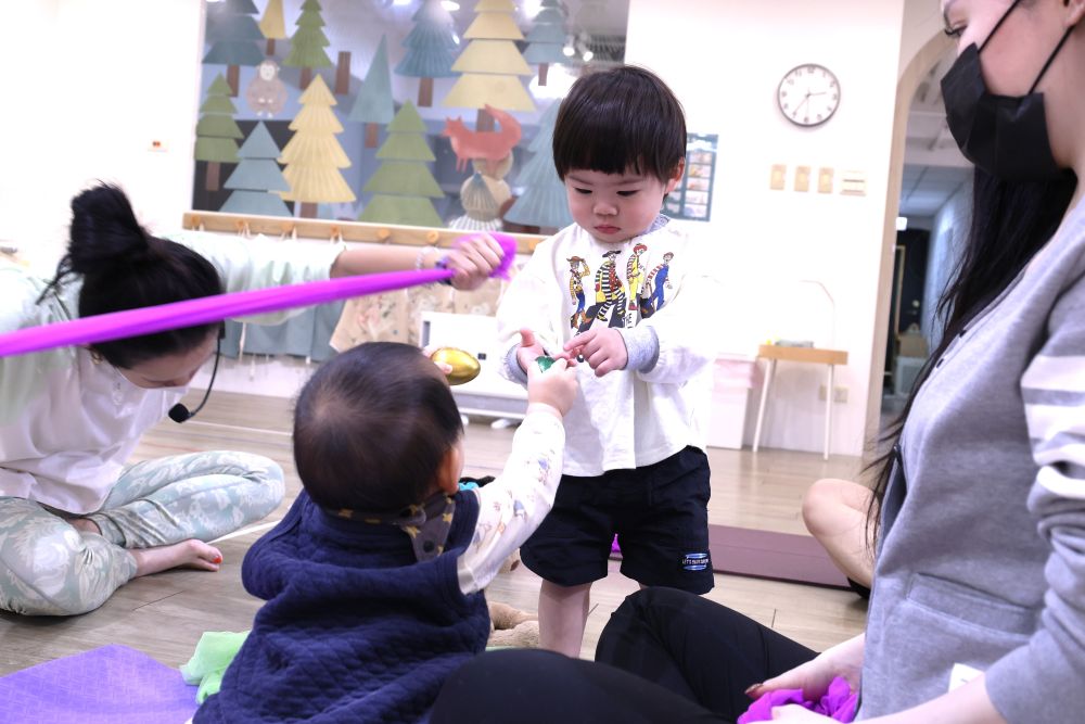 我們一起圍圈圈跳舞,認識彼此打招呼~接著一起暖暖身,讓孩子在爸媽懷中安心的玩鞦韆,或是親子來一場雙人舞~開始好玩有趣的主題活動,最後一起玩絲巾澎澎嚕啦啦!