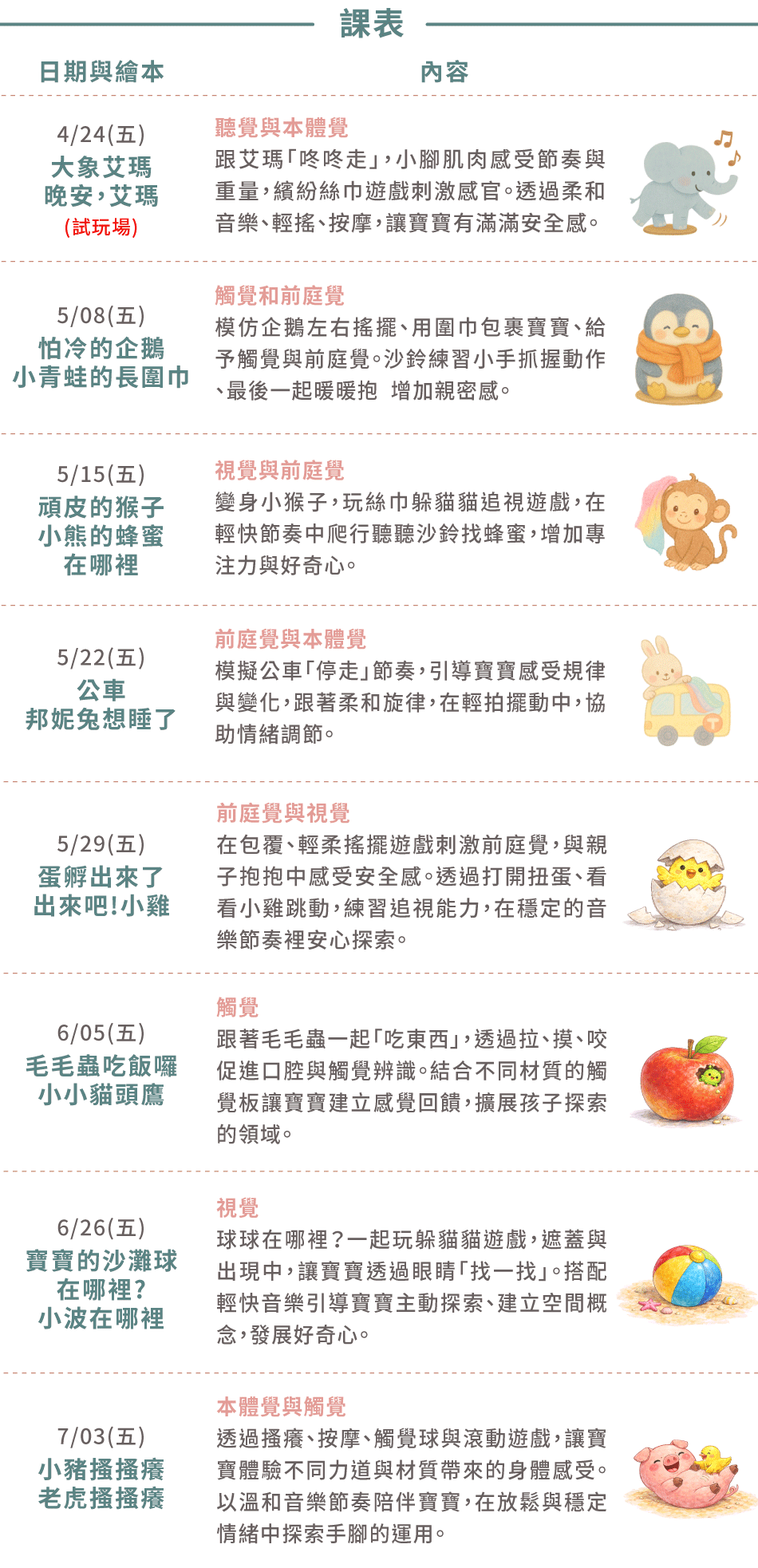 - 練習前庭覺、觸覺與本體覺,為日後翻、爬、坐等大肌肉動作奠定基礎。
