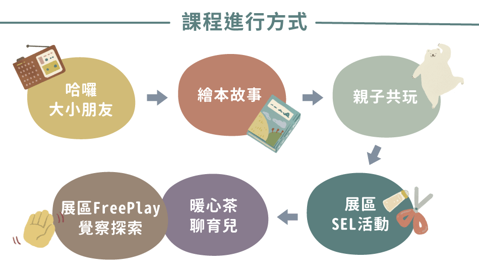 每堂課都從簡單的打招呼開始,慢慢帶進繪本故事,讓孩子在故事裡產生共鳴,接著透過各種親子一起動手、動身體的遊戲活動,把情緒與互動自然帶進日常。課程中也會使用展區的多元素材,讓孩子自由探索、嘗試,在玩樂中累積經驗,而不是被要求完成什麼任務。