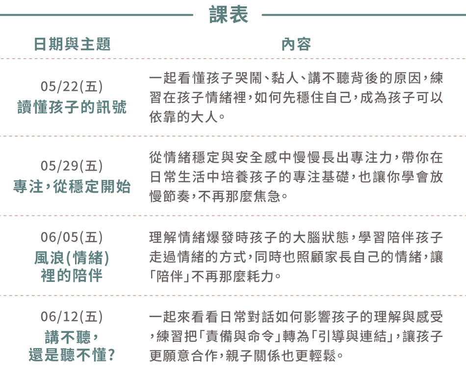 四堂課會用不同主題設計活動,讓親子在遊戲中自然累積相處的經驗。從第一堂看懂孩子情緒反應、如何穩定情緒提升專注力、經歷情緒起伏時的陪伴,練習用更容易被孩子接受的方式說話與引導。在遊戲中慢慢找到彼此舒服的節奏,讓親子在一次次的共玩中,慢慢找到更順暢的相處方式。