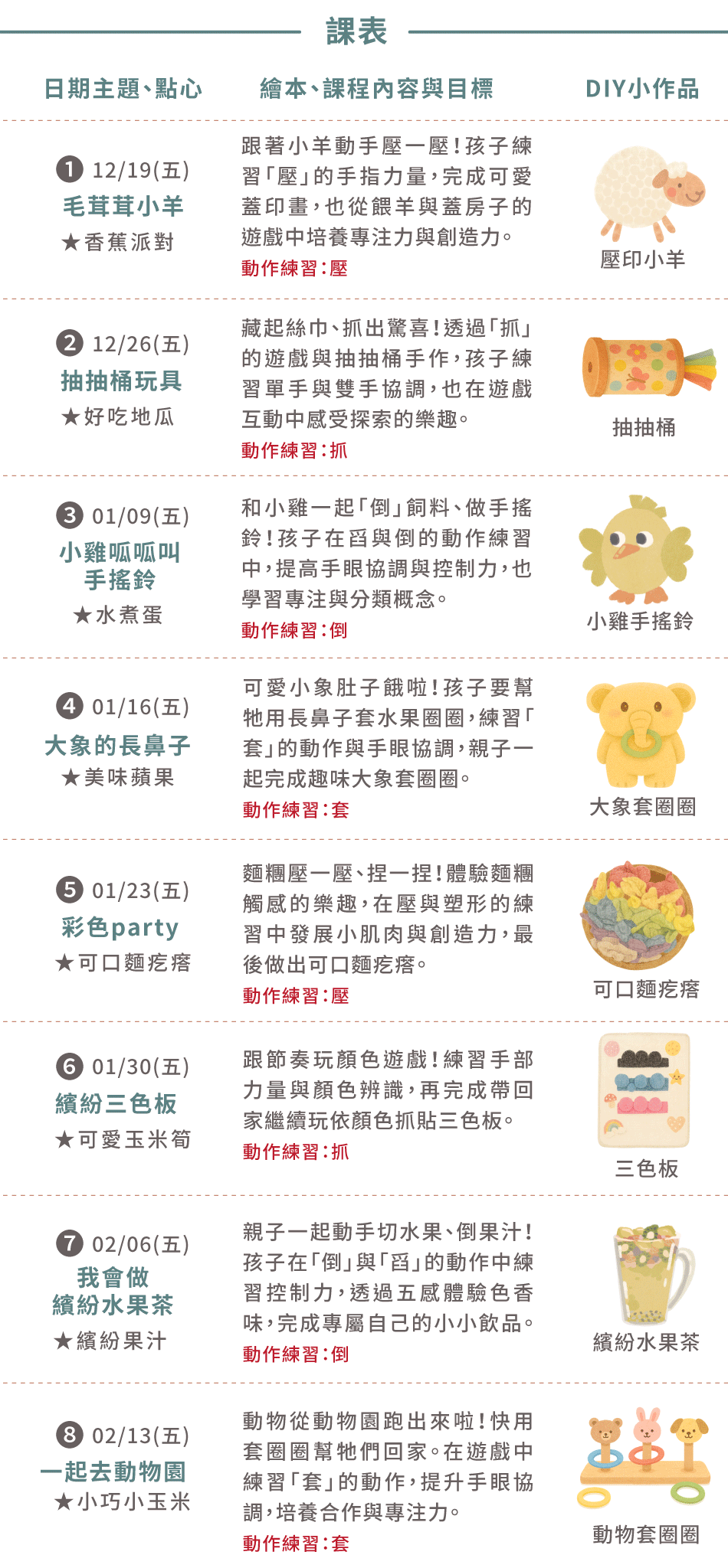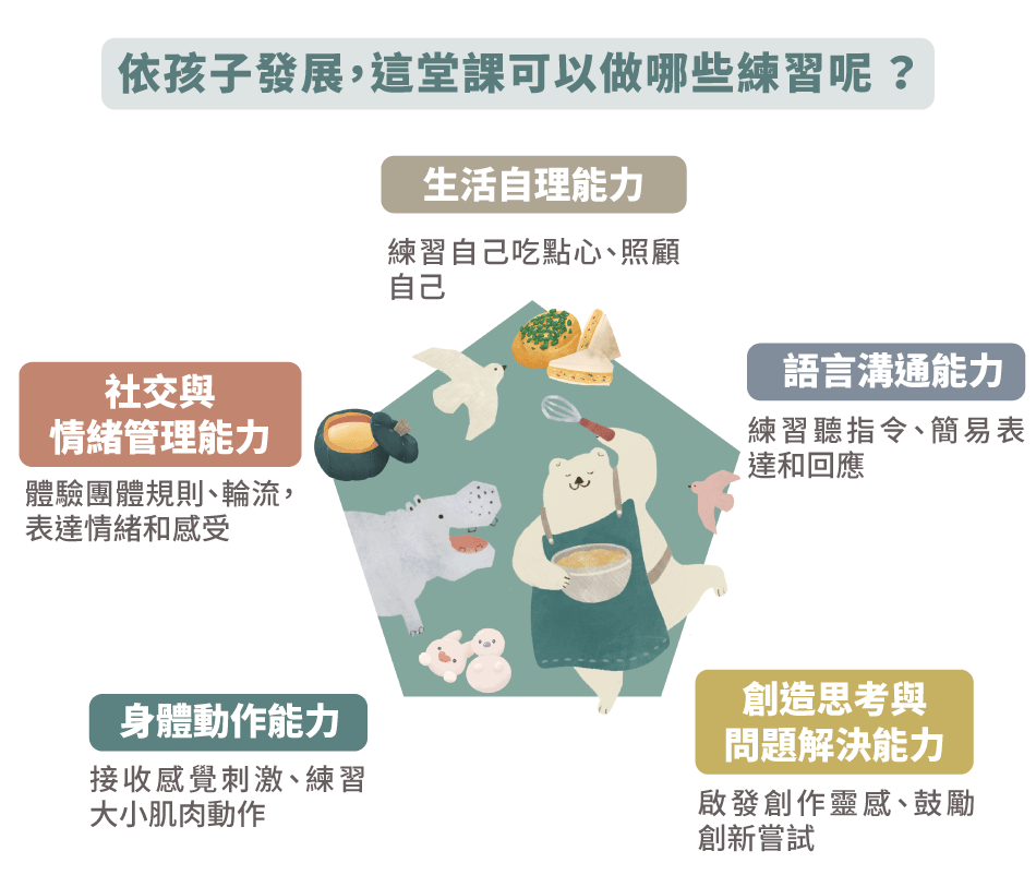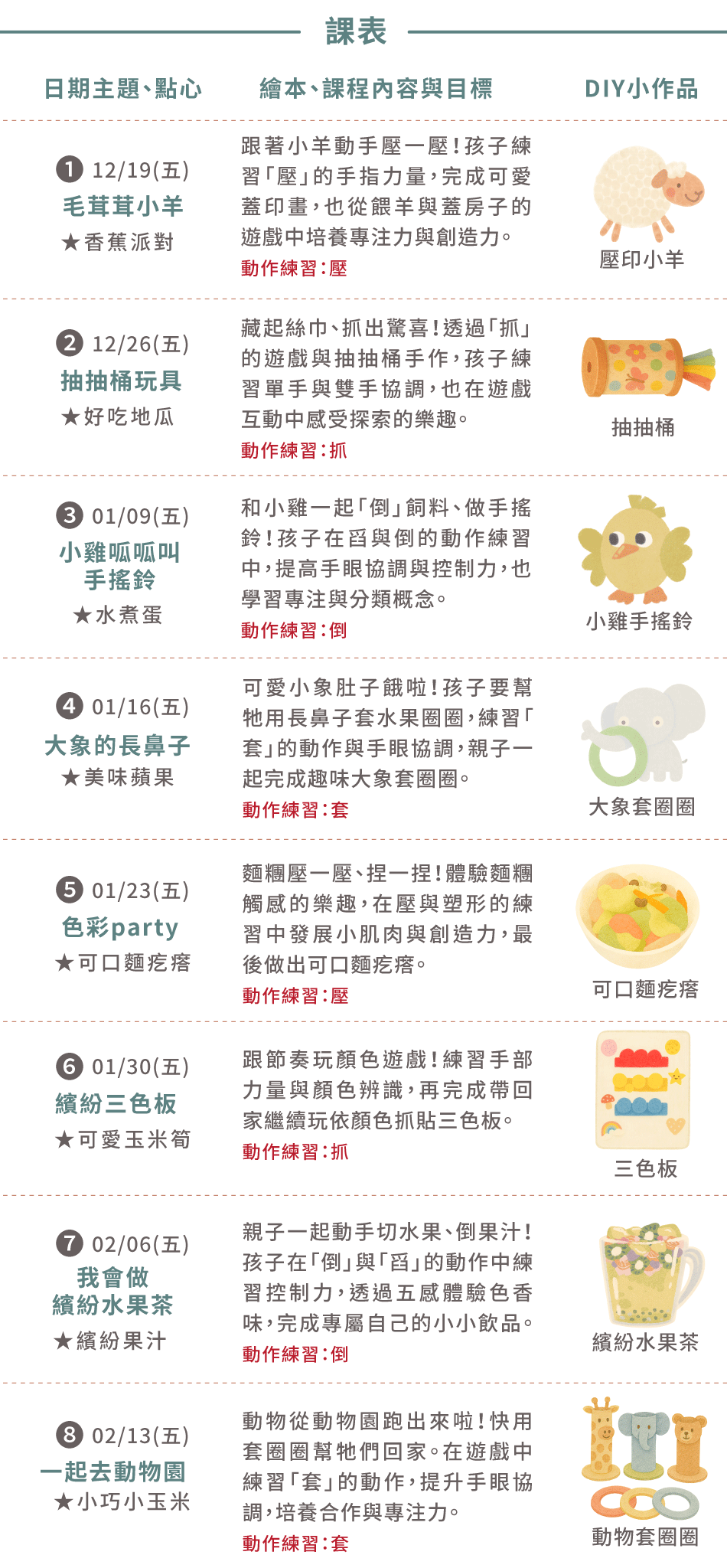 從孩子生活經驗中,最容易接觸到的事物進行主題設計,例如:可愛的動物與健康的水果等等,每堂課以繪本貫穿,孩子跟著故事情節一起律動、遊戲與DIY手作,練習「壓、抓、倒、套」等精細與大肢體動作,也學習等待、輪流與情緒表達。親子還能一起動手做與享用點心,從實際操作中體驗生活自理的樂趣,讓「玩」成為孩子最自然的學習方式,慢慢增進熟練度!