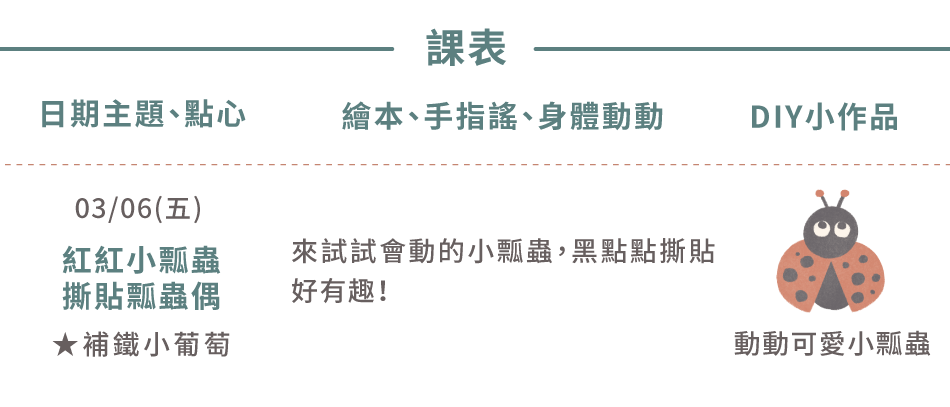 這年紀的寶貝,對任何細微的事都感到興趣:掉落公園地上的落葉、花圃中的小瓢蟲等等,適合培養孩子的觀察力,從遊戲式的活動帶領中,以尊重、鼓勵、引導的方式帶領,這時期也是身體動作發展的敏感期,從大肢體律動、到小肌肉精細動作的可愛手作DIY練習,讓我們與小寶貝們一起開心練習吧!