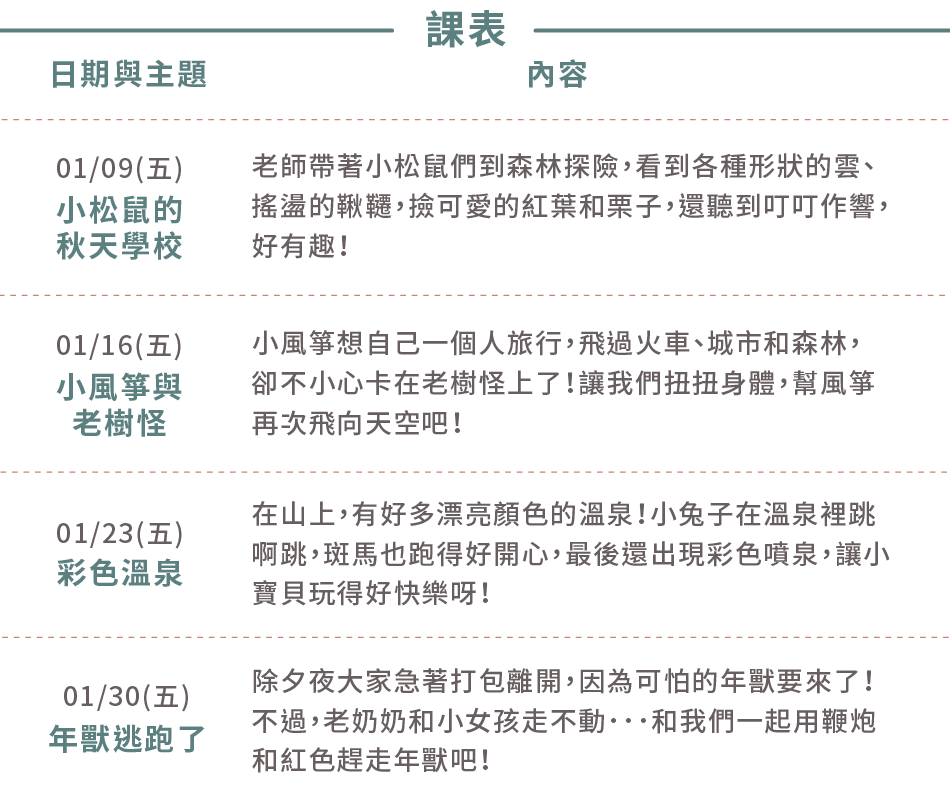 - 為維持課堂品質,大教室維持一位大人陪同;若需帶二寶,請先洽詢老師。
