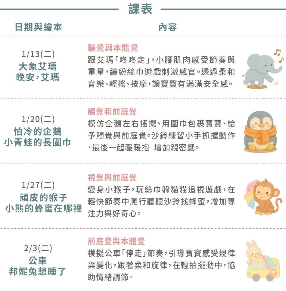 【台北】2026寶寶音樂 動物相見歡(1-2月週二下午) 關於課程