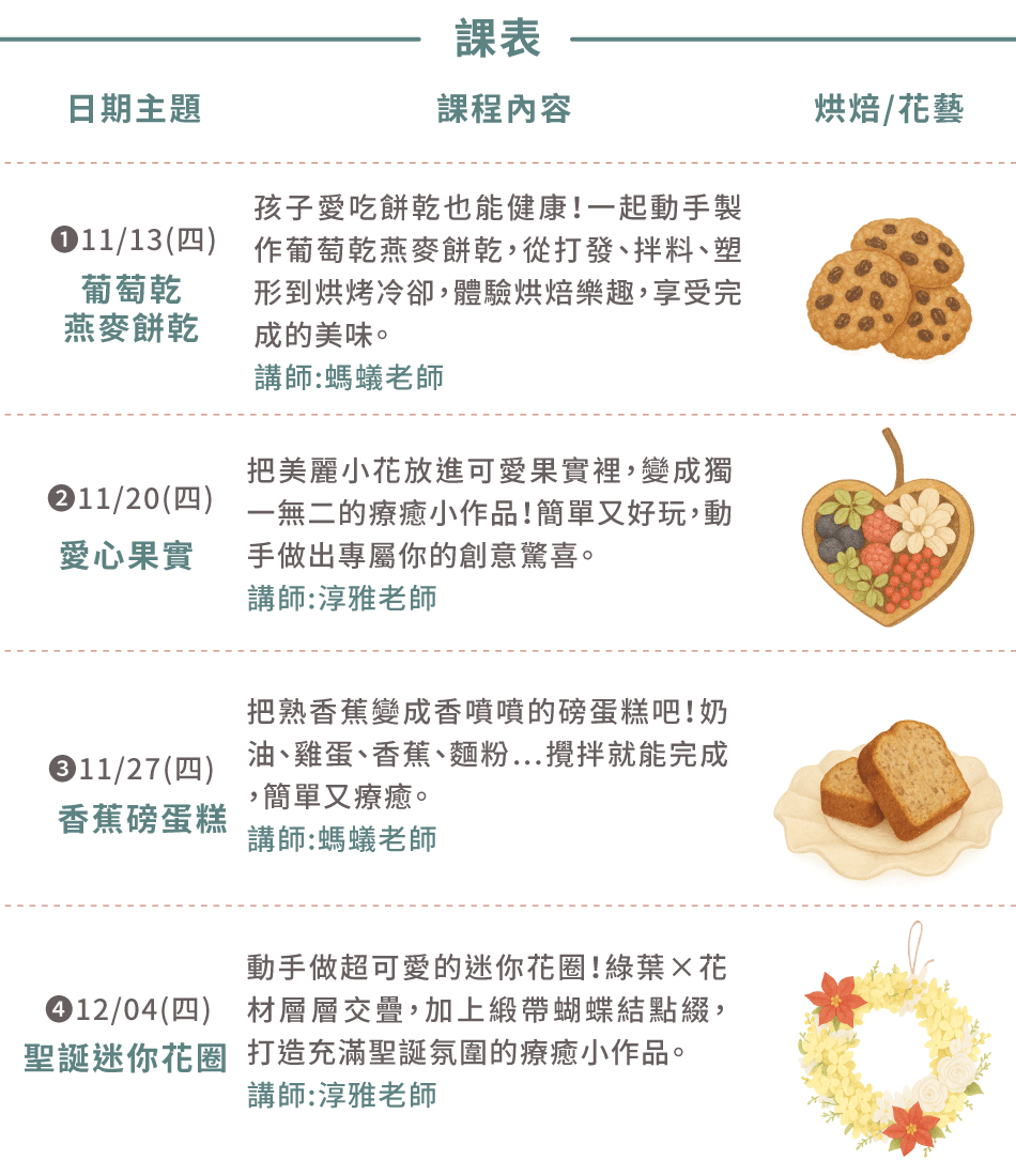 在課堂裡,我們將以 花藝 × 烘焙 的雙重體驗,陪你找回平靜與專注。親手創作花藝作品,感受美的力量;專注於烘焙的香氣與步驟,做出美味小點心帶回家與孩子分享。透過動手做的過程,放下焦慮,享受療癒的美好。
