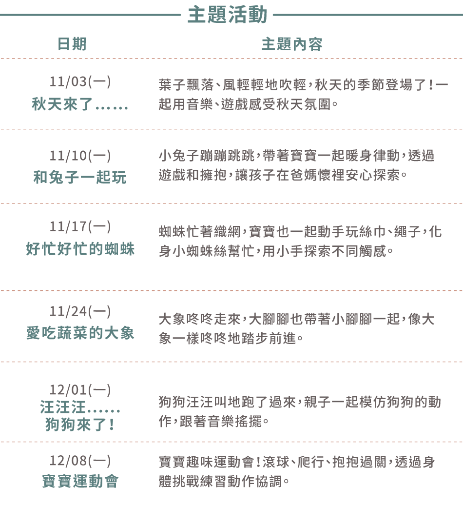 擁有豐富育兒經驗的雯雯老師,設計了溫柔可愛的主題活動,結合自製繪本與簡單的身體遊戲,讓孩子在律動中感受快樂,幫助孩子訓練大肌肉群的發展,強化核心肌群和平衡能力,支持孩子走路、爬行和跑跳等大動作技能,也讓大人與孩子透過擁抱、舒緩筋骨等小動作,與孩子建立穩固的依附關係。
