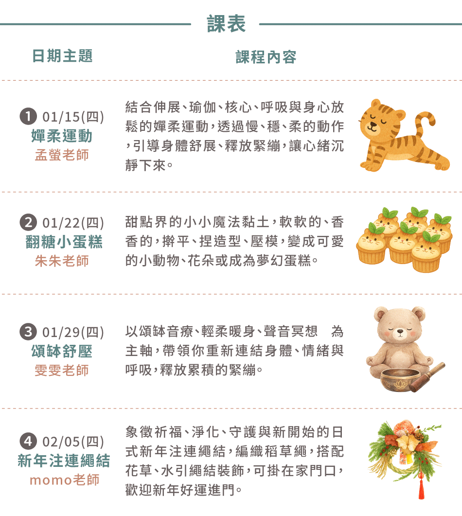 - 日期:2026/1/15-2/5週四上午 10:00-11:00(共4堂,請參考上方)