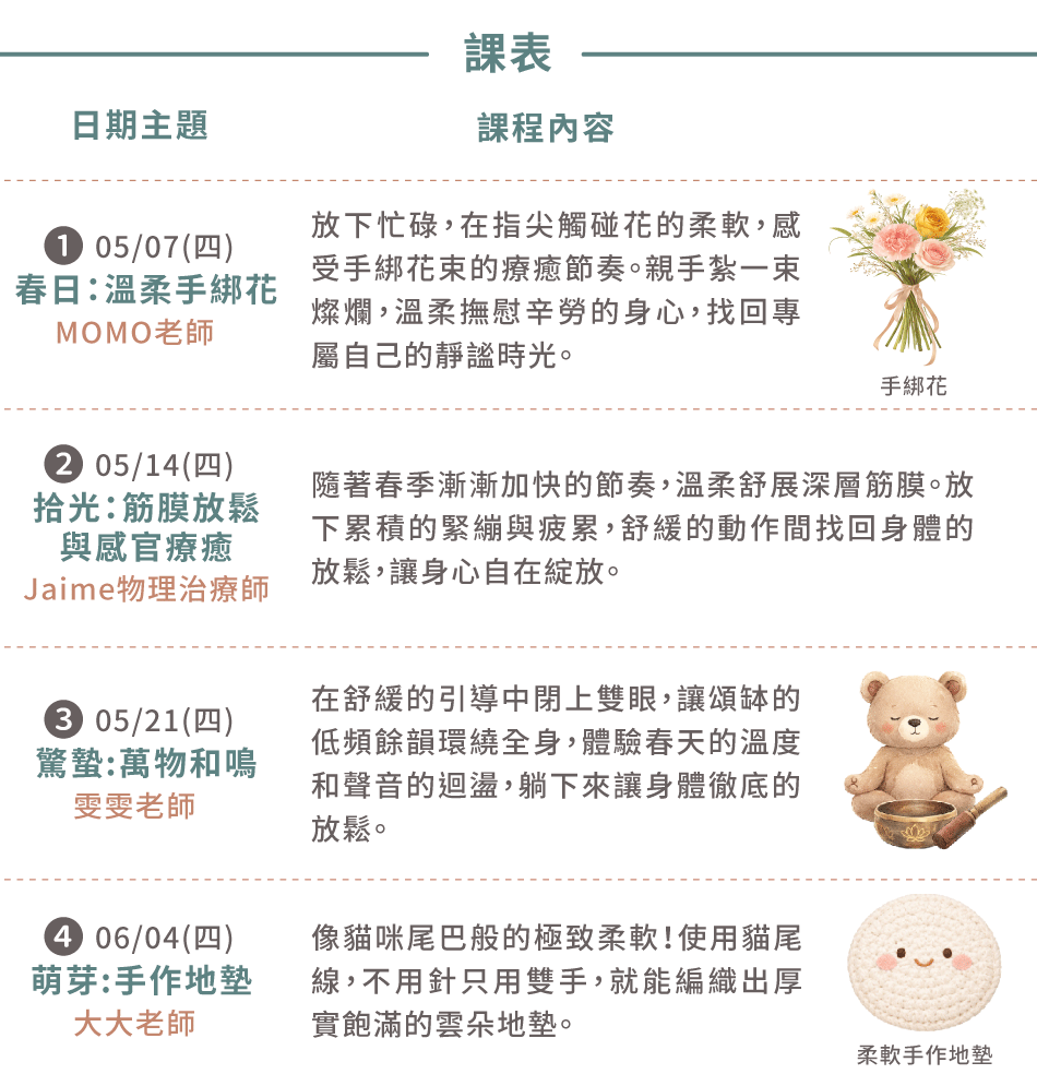 - 4 位講師 × 4 種風格療癒:花草手作、筋膜放鬆、聲音療癒、柔軟編織