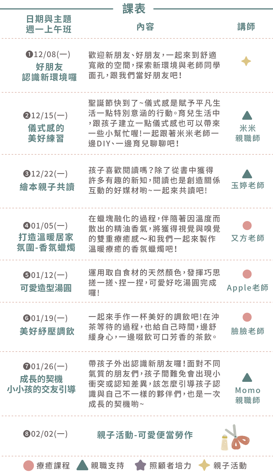 每週有一杯飲品還有一小時的家長活動唷!分為三大類型課程:療癒課程、親職支持與親子活動,本系列大人主題將分享如何引導孩子進行獨立探索的小練習,「依附關係」是一個關鍵!親職師在第一堂課會提供練功秘笈,第2堂課開始,家長和孩子就會上不同的課程囉,一起來看看課表有什麼豐富的大人課程活動吧!