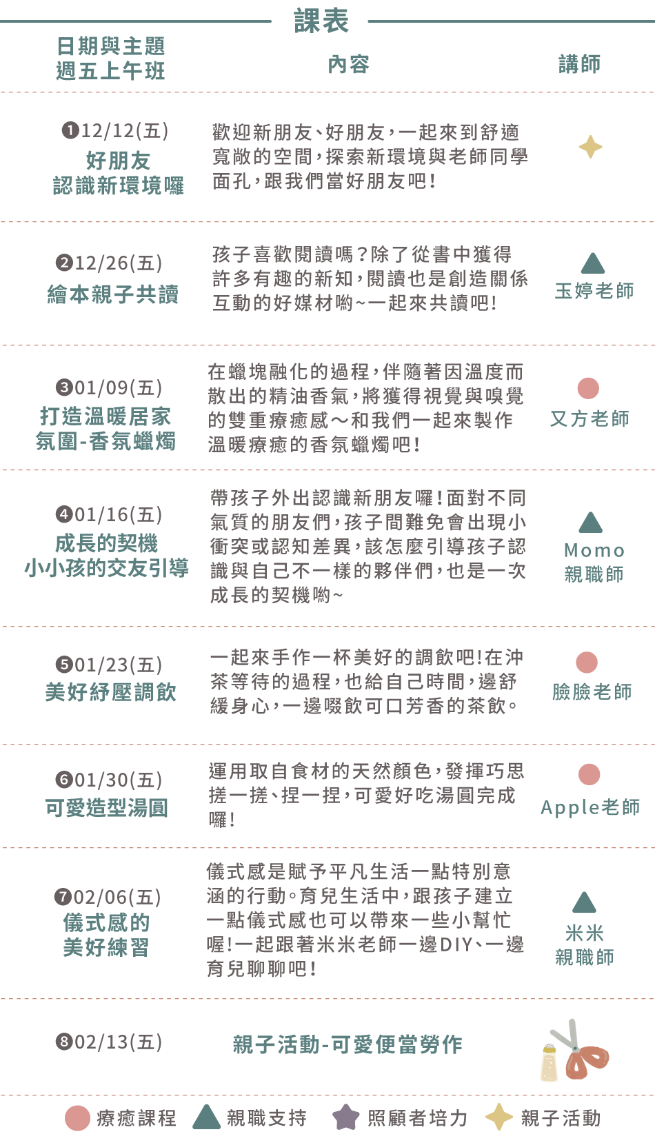 每週有一杯飲品還有一小時的家長活動唷!分為三大類型課程:療癒課程、親職支持與親子活動,本系列大人主題將分享如何引導孩子進行獨立探索的小練習,「依附關係」是一個關鍵!親職師在第一堂課會提供練功秘笈,第2堂課開始,家長和孩子就會上不同的課程囉,一起來看看課表有什麼豐富的大人課程活動吧!
