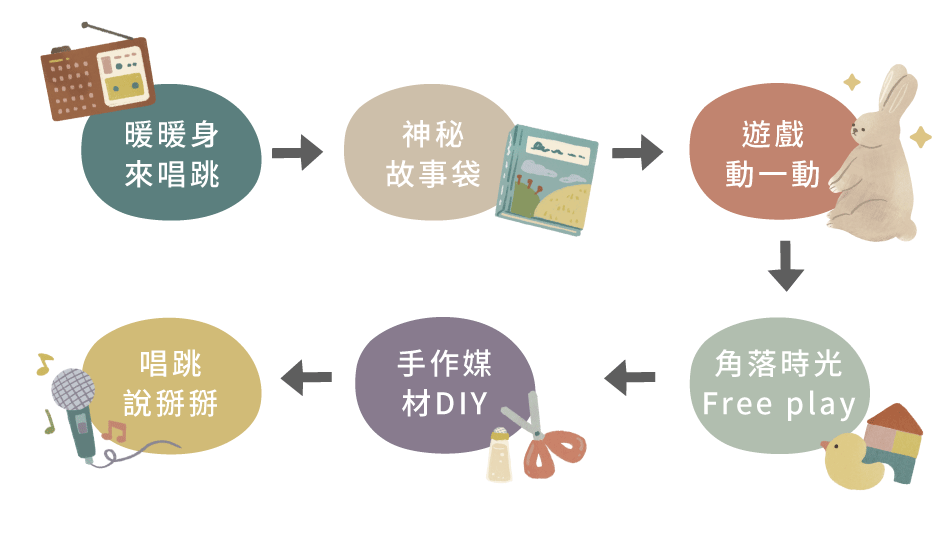 一起身體動一動、暖暖身跳個舞吧!聽最喜歡的繪本故事,接著依繪本故事延伸玩遊戲、自由探索的時光、用不同的媒材DIY創作,最後一起整理環境,跳舞說再見囉!