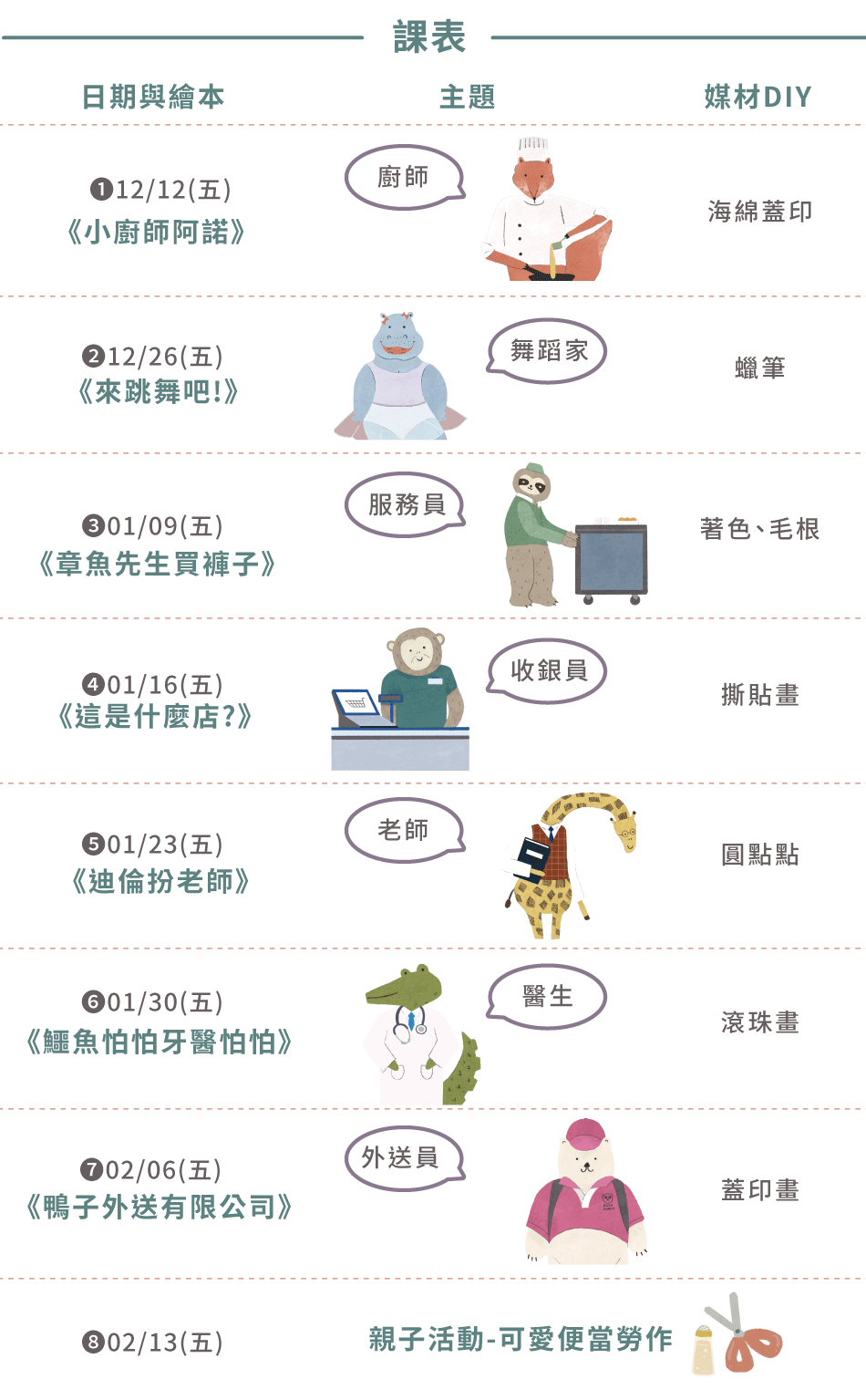 2025年冬季小時光以「職業」主題,每週不同的繪本故事,進行好玩的主題遊戲、運用不同媒材DIY創作,最後還會集結成一本小書唷!課程中,也安排孩子自由探索時間,培養他們的創造力和解決問題能力,暢遊自己的play time!