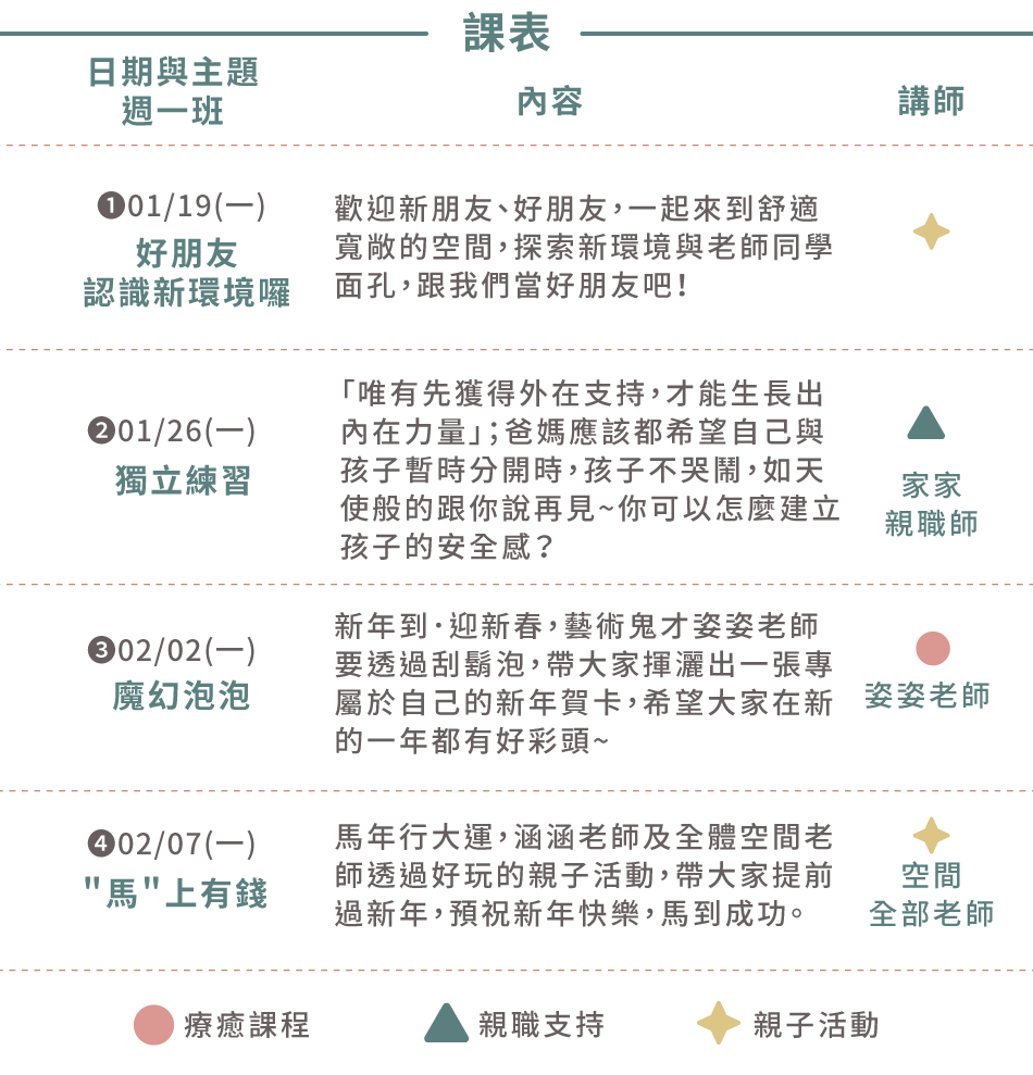除了一杯飲品與稍作休息,每週會有一小時的照顧者活動,分成四大類型課程:療癒課程、親職支持與親子活動,安排不同的老師來與大家分享,這次有滿滿的過年氣息喔,有姿姿老師的魔幻泡泡的新年賀卡與空間老師全體一起"馬"上有錢的新年活動,還有家家老師育兒聊天室,幫家長們協助孩子獨立練習,建立安全感!