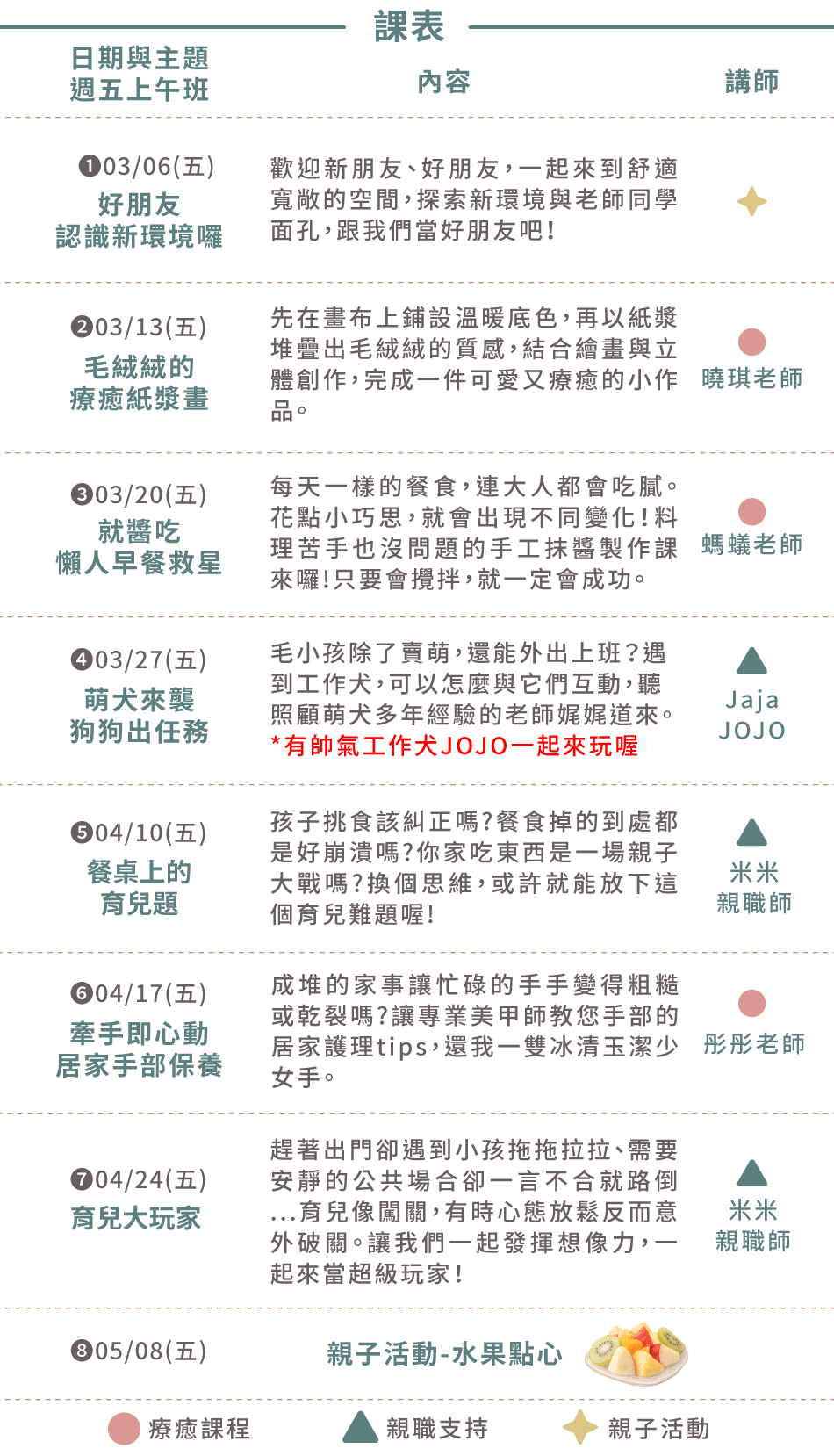 每週有一杯飲品還有一小時的家長活動唷!分為三大類型課程:療癒課程、親職支持與親子活動,本系列大人主題將分享如何引導孩子進行獨立探索的小練習,「依附關係」是一個關鍵!親職師在第一堂課會提供練功秘笈,第2堂課開始,家長和孩子就會上不同的課程囉,一起來看看課表有什麼豐富的大人課程活動吧!