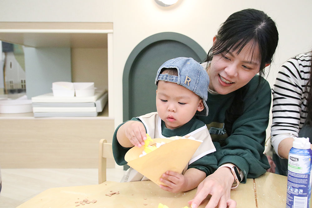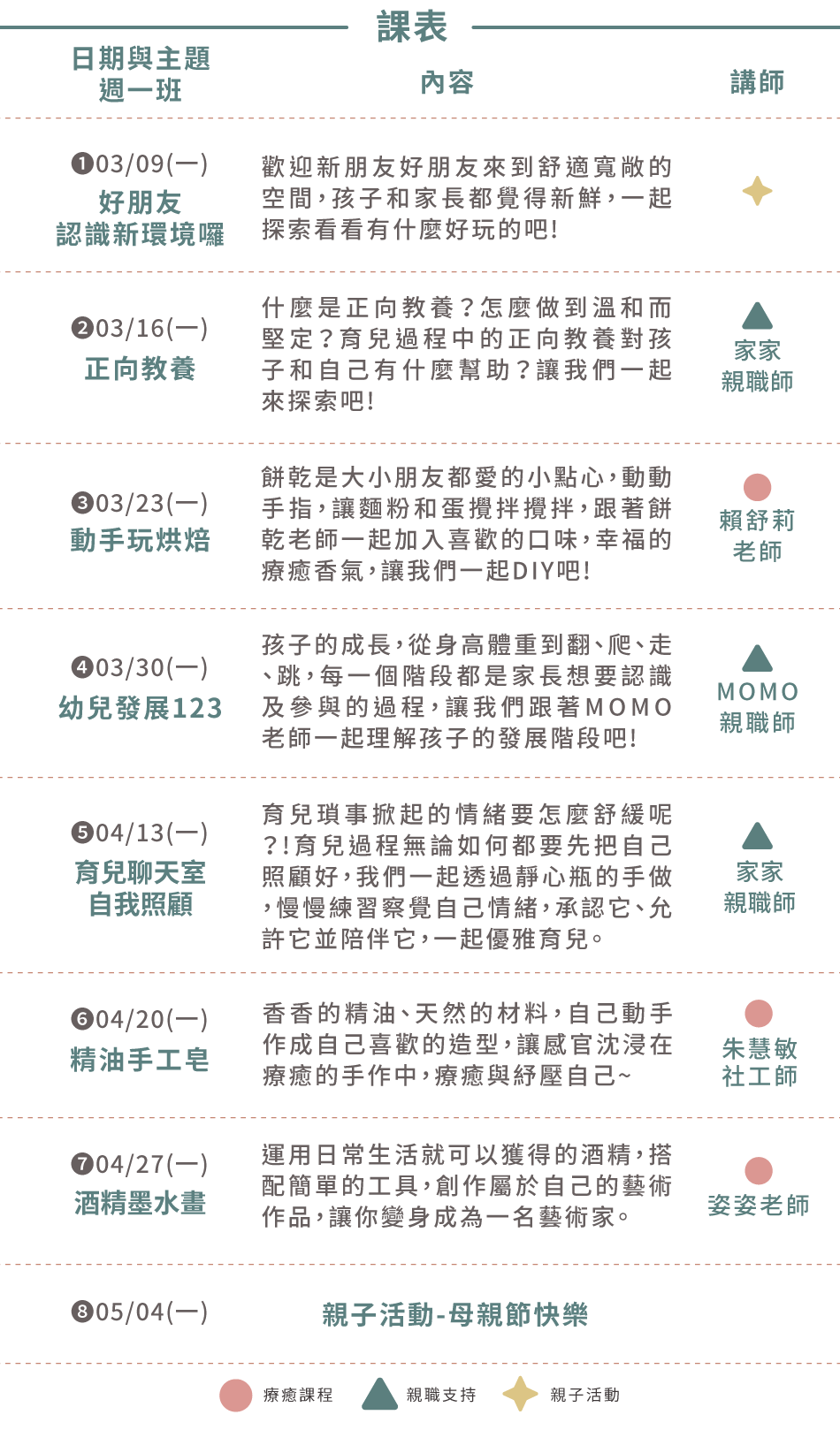 除了一杯飲品與稍作休息,每週會有一小時的家長活動,分成四大類型課程:療癒課程、親職支持與親子活動,安排不同的老師來與大家分享,這次可以動手玩烘焙、製作手工皂與創作酒精墨水畫,還有家家老師育兒聊天室,最後一堂再一起慶祝母親節快樂!