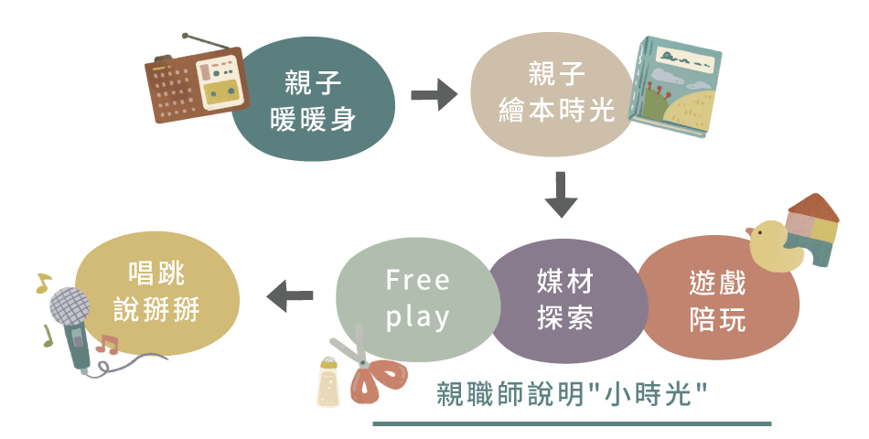 親子們一起打招呼、聽繪本,接著親職師會與大家說明與介紹小時光,同時段老師們會引導遊戲與自由探索、媒材創作等, 60 分鐘的說明與體驗,一起讓大家認識我們!在課程的最後,讓我們帶著滿滿的能量一起唱跳說再見!