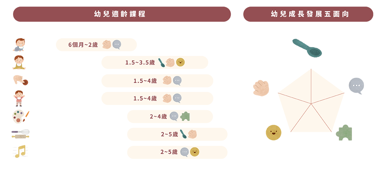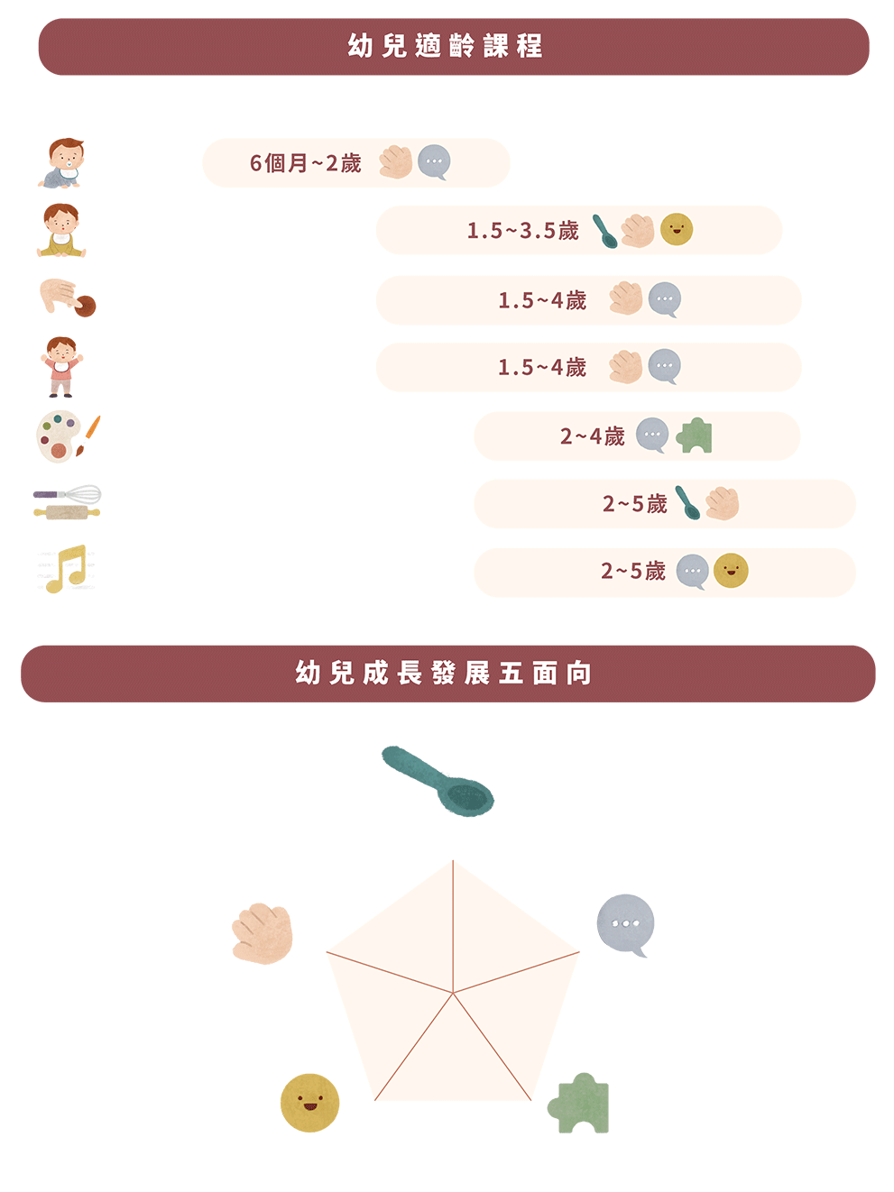 專為0-1.5歲嬰幼兒設計的寶寶系列課程,透過專業的寶寶音樂、抱抱親密律動,引導寶寶在溫馨氛圍中探索聲音與觸覺,有效促進翻、爬、坐等大肌肉發展。在音樂與擁抱等肢體律動下,安撫寶寶情緒、刺激大腦發育,讓家長與孩子建立親密依附關係。幼兒發展